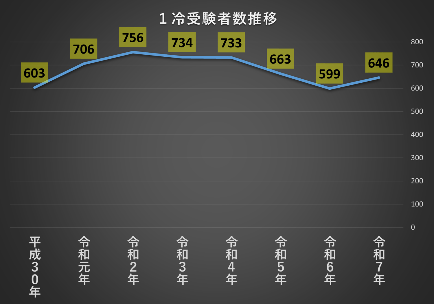 受験者数は700人前後で安定しています。ていうか、全国でこれしか受験してないってやばいですよね・・。