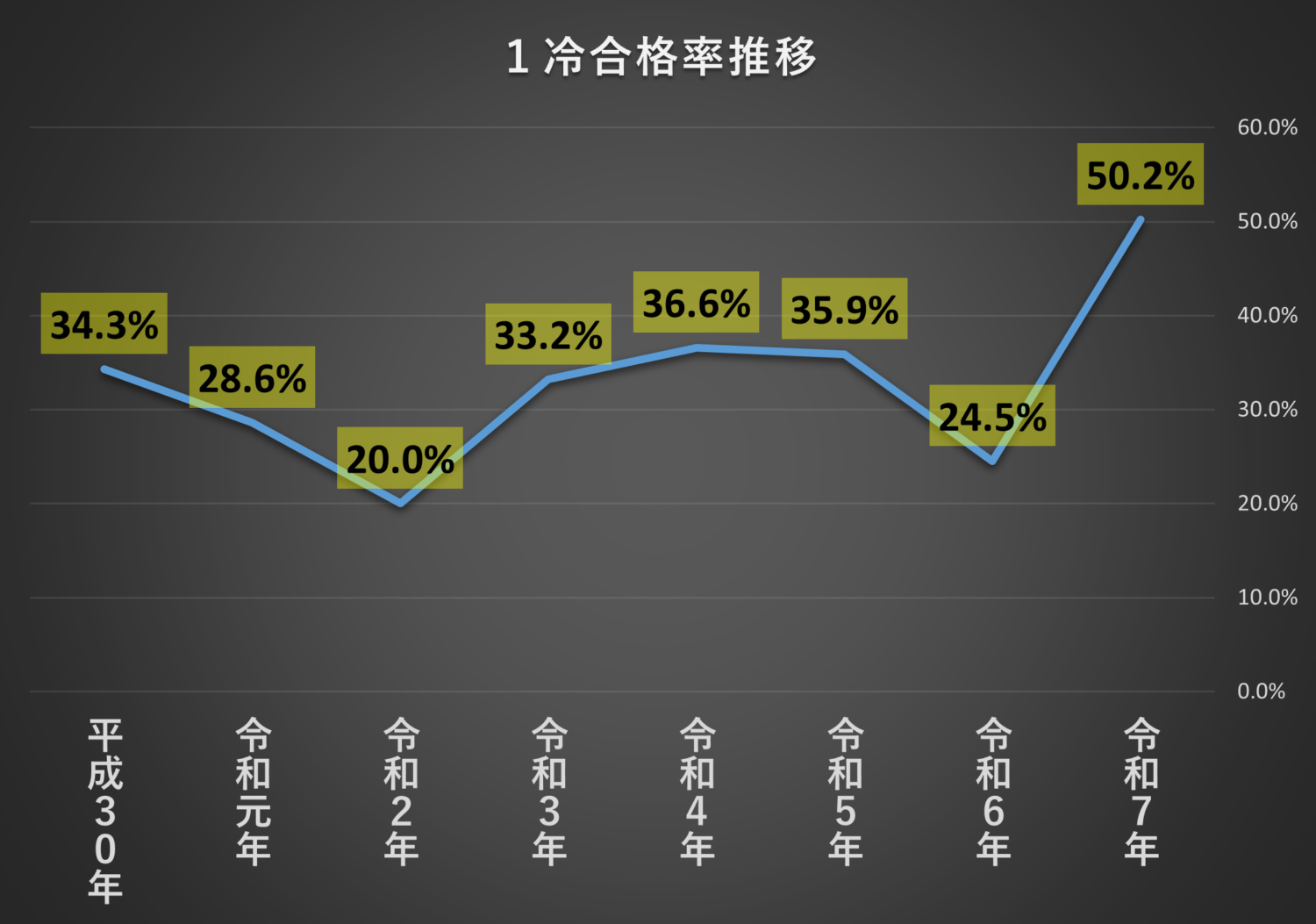 一番合格率が高かったのは、最新の令和7年の試験で「50.2%」というかなり高い数値になっています。