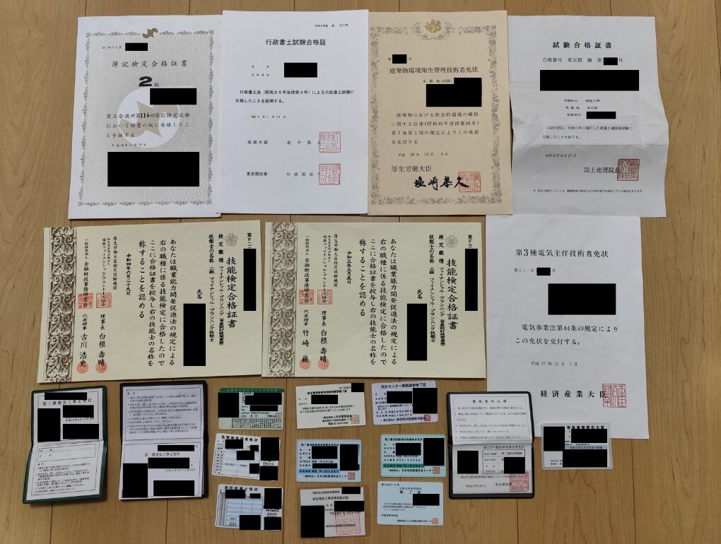• 法律・事務系: 行政書士、宅地建物取引士、日商簿記二級、2級FP技能士