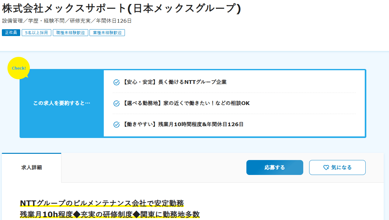 しかし、年間休日は多いですし、「未経験可」と採用のハードルも低いため、ビルメン経験が浅く応募できる企業が少ない人は親会社である日本メックスへの転籍を狙って入社しても良さそうですね。