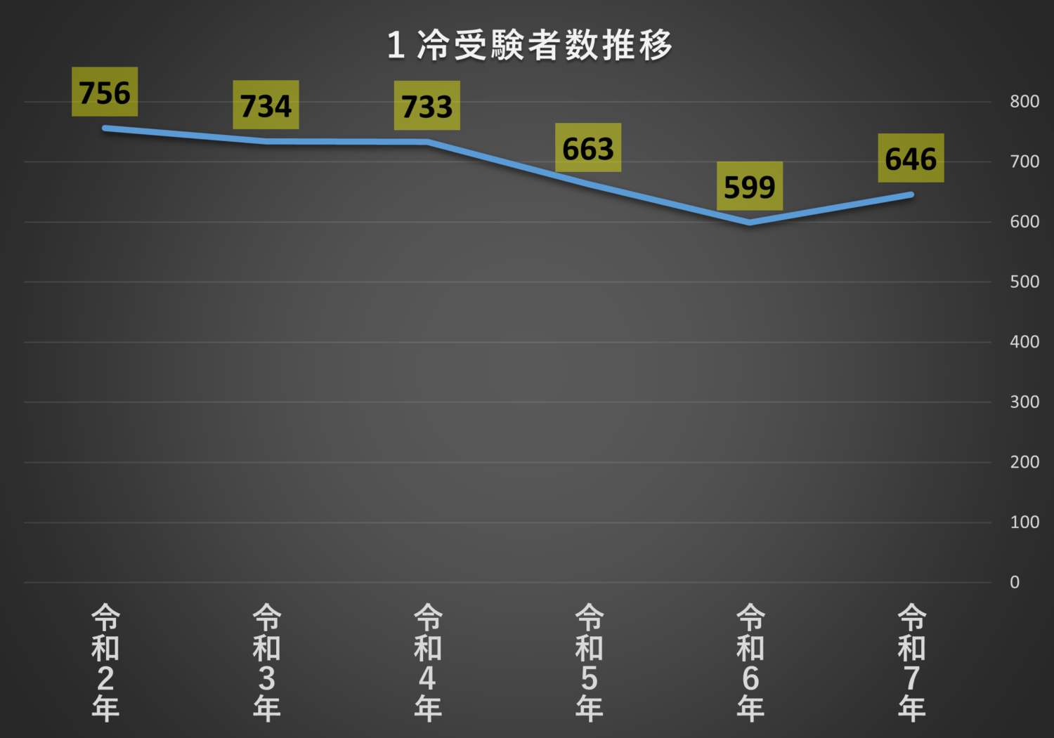 令和7年度第一種冷凍機械責任者の受験者数は646人でした。前回よりも47人増えていますね。